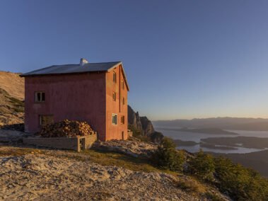 From the ridge the descent is also on loose slate rocks at first down to a first valley, one of the basins to the Goye creek. Past the valley you ascend up to the Bailey Willis peak, continue along the ridge line for quite a while until you start to view the “Negra lagoon” and the Manfredo Segre Hut behind it on the shore. Head down towards the lagoon and go around on the left, there are a couple of sections with rope to help get past the steep walls. A few more meters and there is the hut.