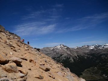 To get to the trailhead you need to take one of the chair lifts or cable cars with Catedral Alta Patagonia. They normally operate from 9 to 17 hs. We recommend you check beforehand to make sure the company is operating. From whichever chairlift you took follow the trails to the ridge just below the Punta Princesa Peak. From here the trail contours just below the ridgeline along a technical rocky trail with a few scrambling sections. After roughly 3.5 km. you reach a junction. (Trail going right heads towards San Martin hut, at Jakob lagoon). Take a left towards what is known as the “Football field”. From here the trail descends pretty steep so watch your step lookout for all the red markings. Careful with snow and ice during November and December. On the way down first you arrive at the Schmoll lagoon and then continue descending on steep terrain and scree down to the valley floor. Contour around the Toncek lagoon on its left side to arrive at the Emilio Frey Hut.